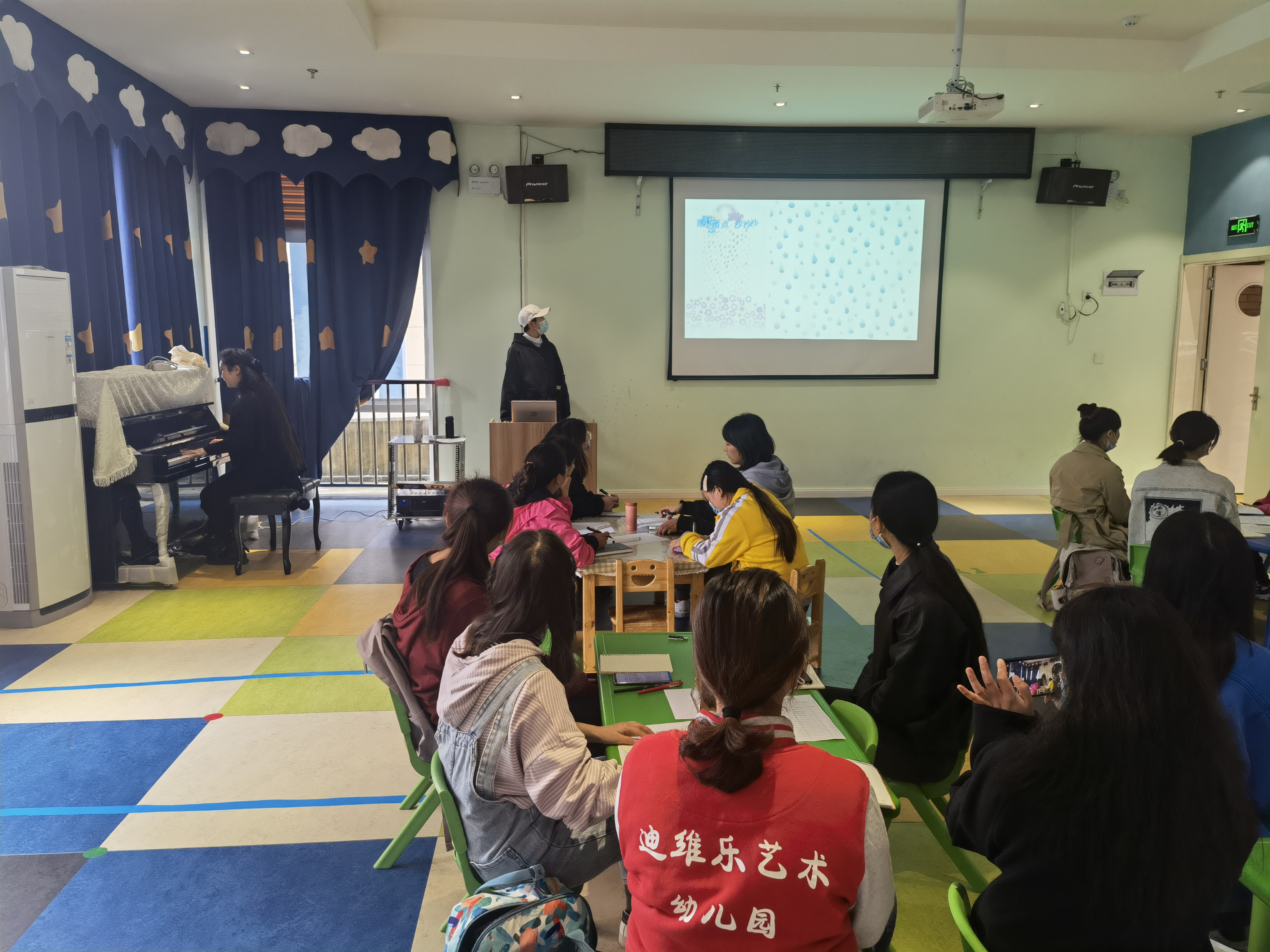 首先,罗婷老师介绍了参与和组织此次教研活动的师生团队,在高新幼儿园老师的欢迎声中开始了此次活动。教研活动以罗胜澜同学自编曲目、配乐诗朗诵《小雨点》拉开了帷幕。罗胜澜同学生动精彩、富有感情的朗诵将老师们带入了诗歌的意境中,教师们也初步感受了诗歌的意境美。演奏完毕后,罗婷老师对“诗歌”核心经验进行剖析,向各位老师们详细地阐释了领域教学知识“PCK”相关理论,细化"PCK"的构成要素,同时结合《小雨点》诗歌,带领老师们理解如何分析诗歌的核心经验,并基于“核心经验”的分析理解这类活动设计的目标。接着,师院学子与高新幼儿园老师共同合作,分成5个小组,每组由一位我院学生作为组长,带领幼儿园老师们按照设计好的“团体探究方案”进行研讨,参与研讨的教师们按照“欣赏诗歌——游戏化回顾核心经验——思考填写‘核心经验分析表’——小组探讨基于核心经验的目标撰写——反思回顾”五个环节有趣而又有效的开展了团体探究活动,在理解“诗歌”核心经验后能对新的一首诗歌进行分析梳理,迁移上一个环节学习的内容。