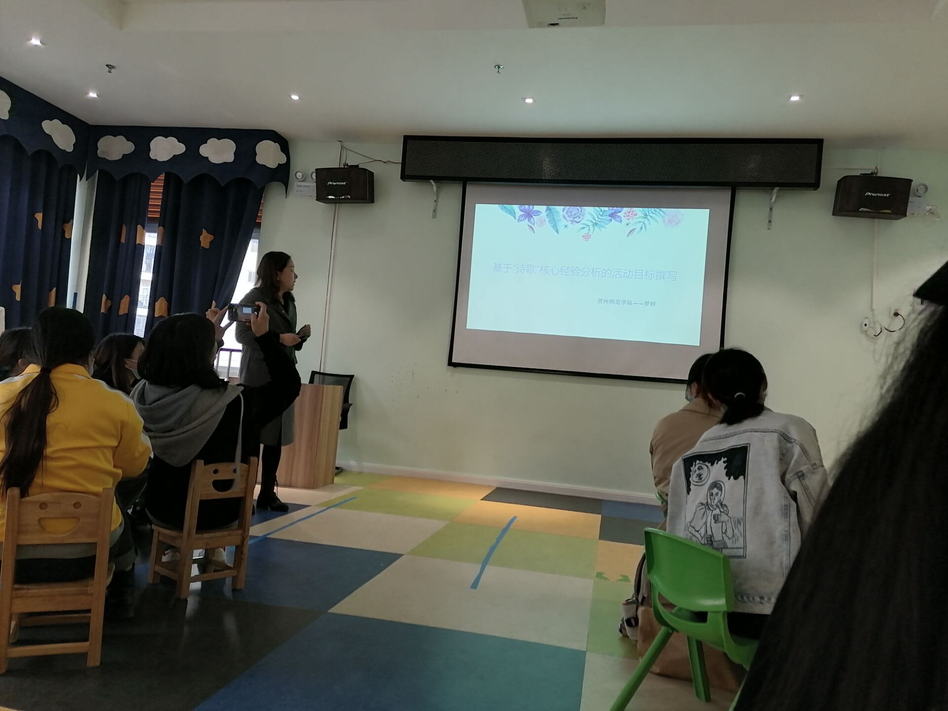 2021年4月16日中午一点,71886a必赢学前教育罗婷老师带领其导师制的2018级与2019级学前教育专业共计八名学生来到乌当区高新幼儿园组织开展“探究式”教研活动。本次教研活动,在真实幼儿园情境中,结合幼儿园教师教学中的难点,尝试采用“专题讲座”结合“团体探究”的新形式。