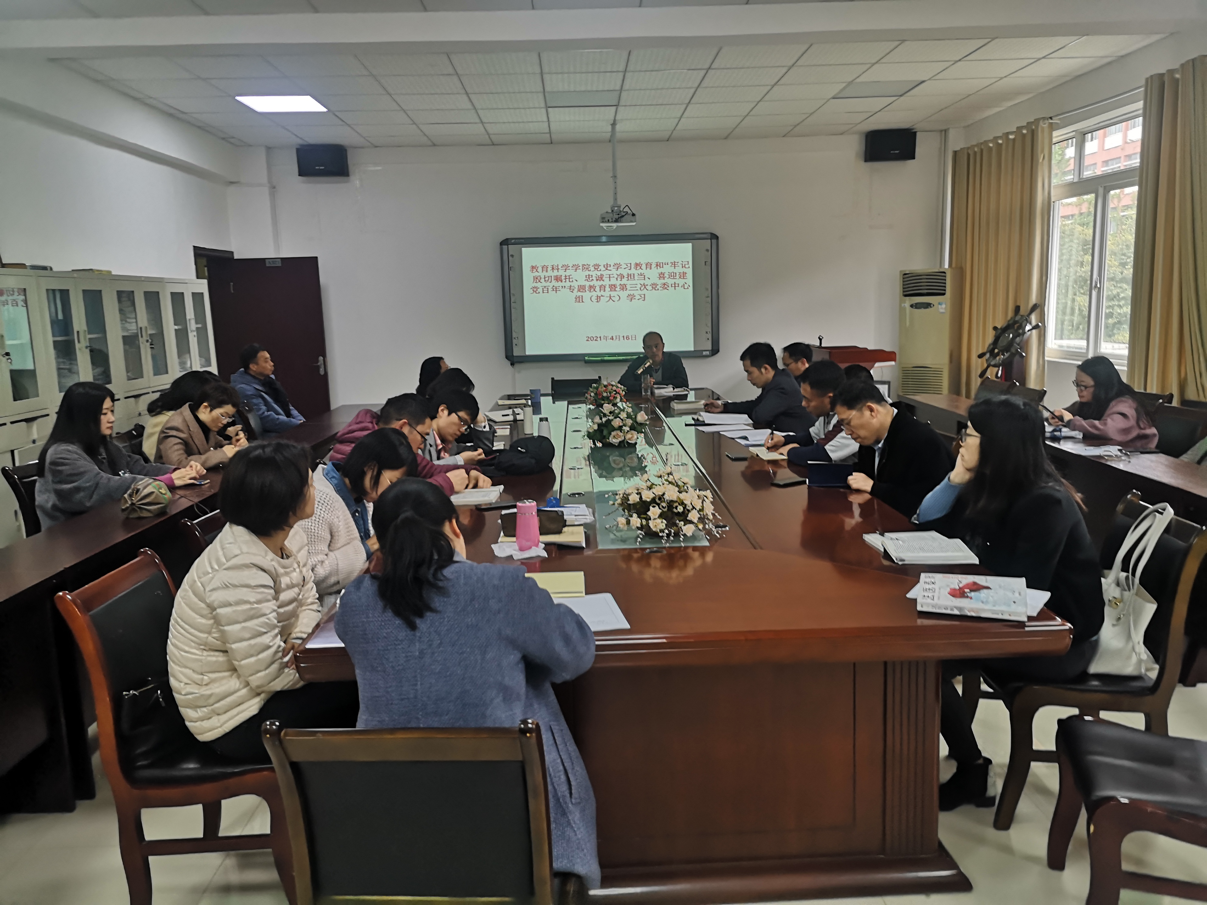 2021年4月16日中午,71886a必赢在逸夫楼学院会议室,举行党史学习教育和“牢记殷切嘱托、忠诚干净担当、喜迎建党百年”专题教育暨第三次党委中心组(扩大)学习,学院党委书记彭祥友主持学习,学院党委中心组成员,全体教师党员参加。