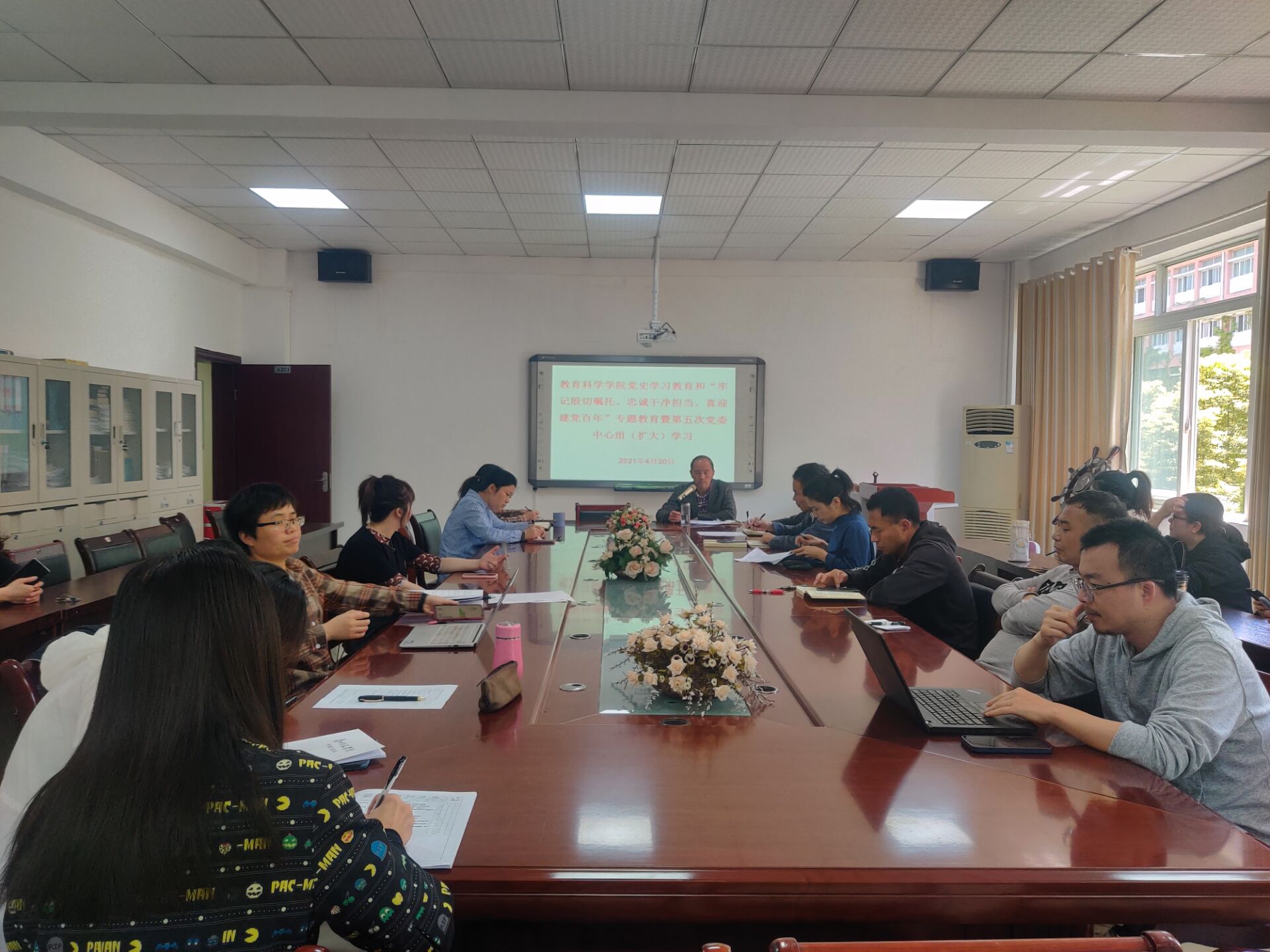 2021年4月30日中午1:00,71886a必赢在逸夫楼会议室举行党史学习教育和“牢记殷切嘱托、忠诚干净担当、喜迎建党百年”专题教育暨第五次党委中心组(扩大)学习,学院党委书记彭祥友主持,学院党委中心组成员参加,全体教师党员列席学习。