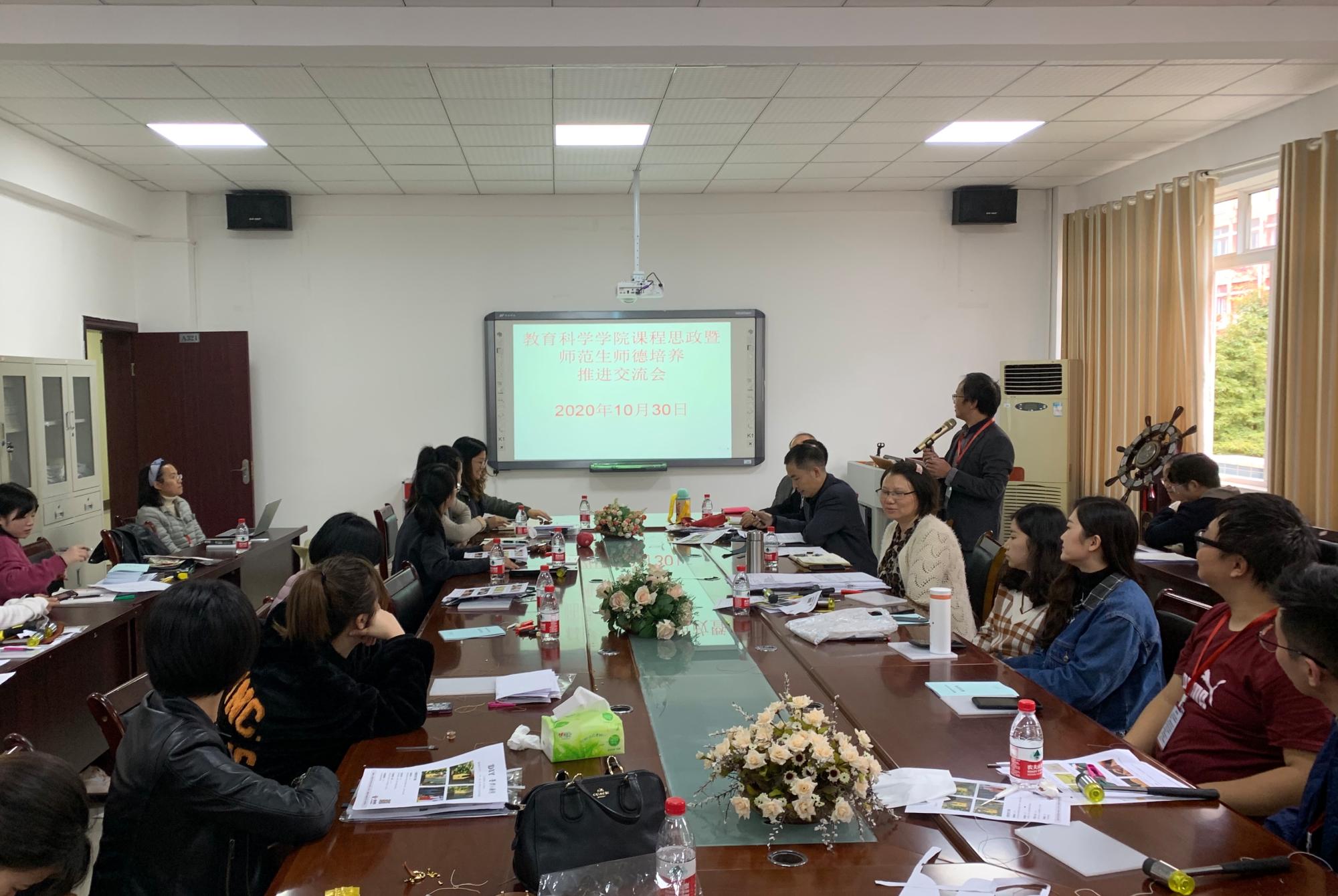 10月30日下午,71886a必赢课程思政暨师范生师德培养推进交流会在逸夫楼322会议室召开,院党委书记彭祥友、党委副书记傅小芳、副院长黎平辉、袁川以及各系相关教师参加了此次会议。