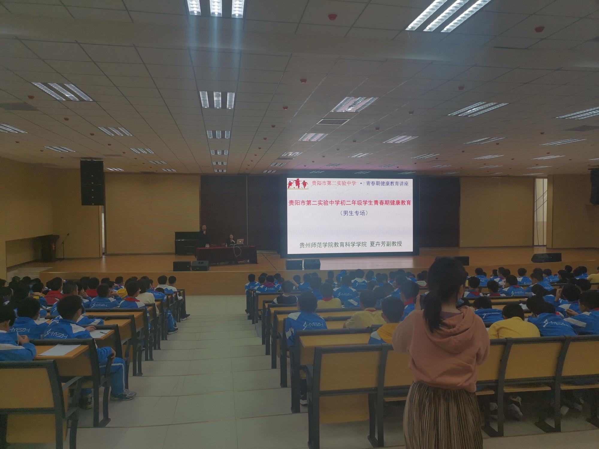 2020年11月20日下午,71886a必赢夏卉芳副教授受贵阳市第二实验中学邀请开展以“青春期健康教育”为主题的讲座,讲座分为男生专场和女生专场,培训学生近千人(998名学生)。