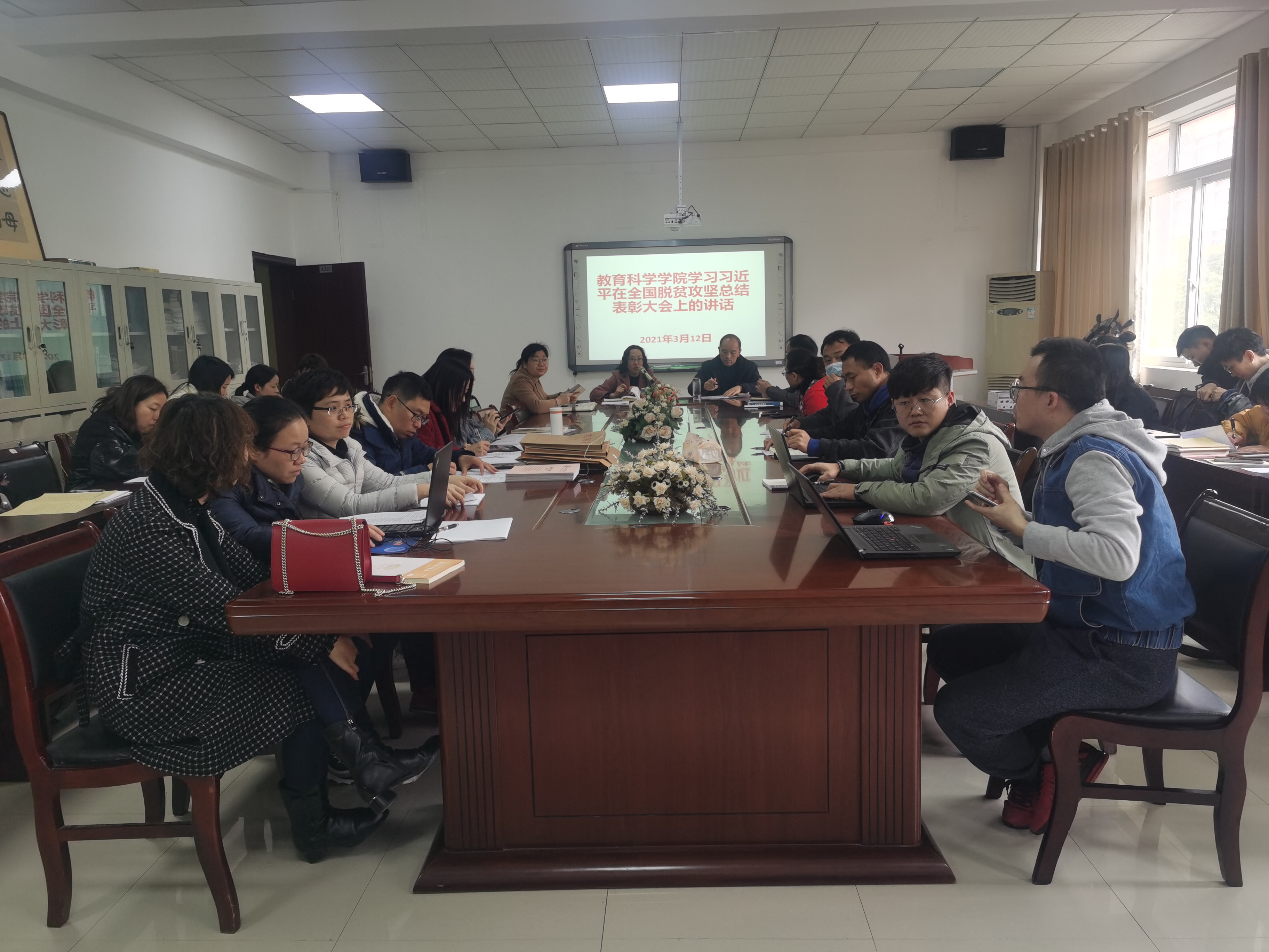 3月12日中午,71886a必赢在学院会议室召开会议,学院党委书记彭祥友向全院教职工宣讲学习了习近平总书记在全国脱贫攻坚总结表彰大会上的重要讲话精神。院长刘红主持会议。