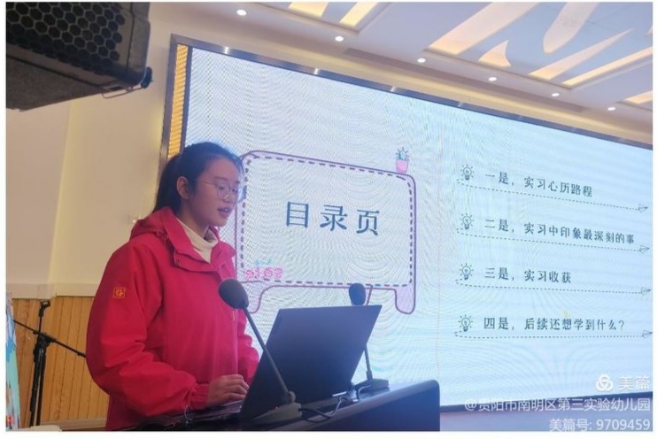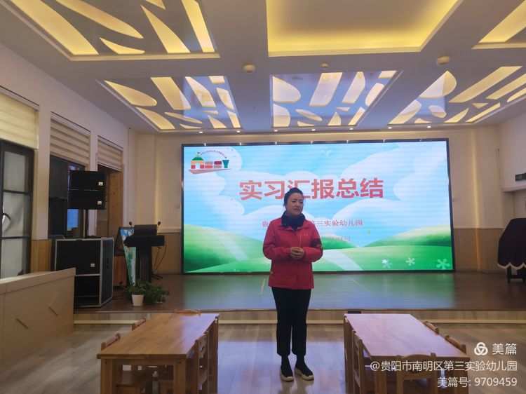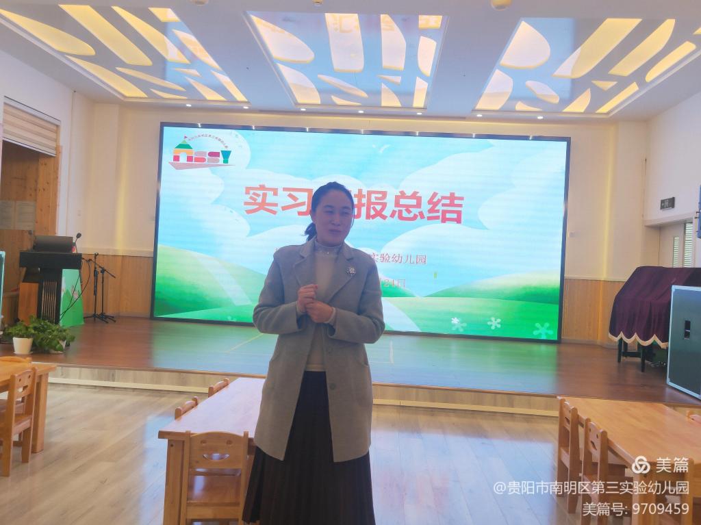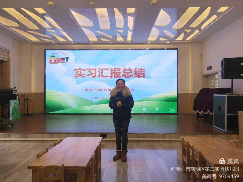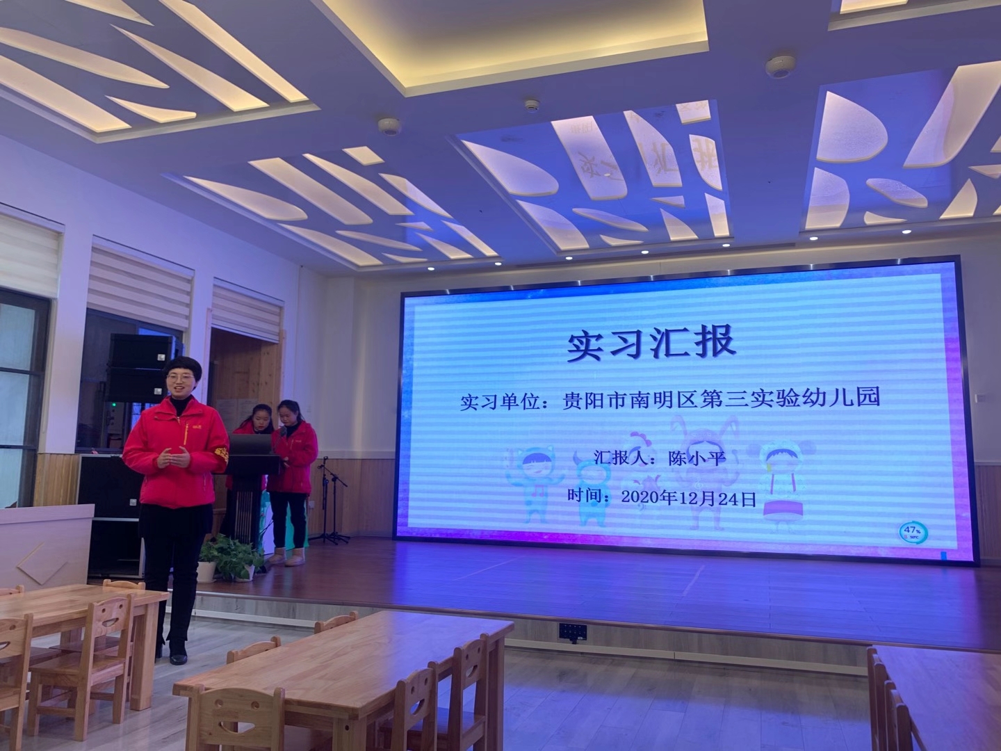 随着2017级学前教育专业学生的实习工作接近尾声,2020-2021学年度第一学期实习学生实习汇报会于2020年12月24日上午9:30在贵阳市南明区第三实验幼儿园活动大厅如期举行。参加此次会议的有贵阳市南明区第三实验幼儿园园长何丽、副园长宋元娥、保教主任何利红、园方实习指导教师,贵州师范学院71886a必赢的实习指导教师郑玉连、陈泽静、李琴以及学前教育专业的实习生也参加了此次汇报会,会议由幼儿园保教主任何利红主持。