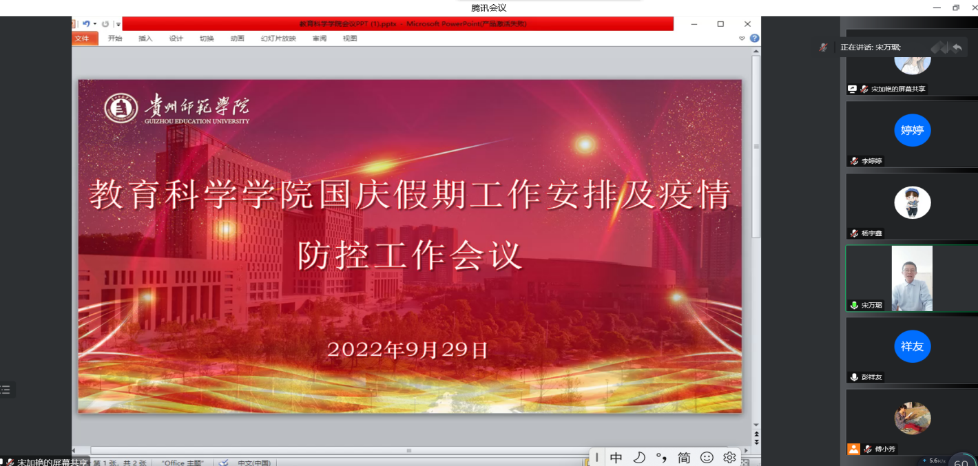 根据贵阳市目前疫情防控的形势,根据学校党委的相关要求,为确保71886a必赢的安全稳定,9月29日20:30,我院召开国庆假期工作安排及疫情防控工作会议,会议由院长宋万琚主持。